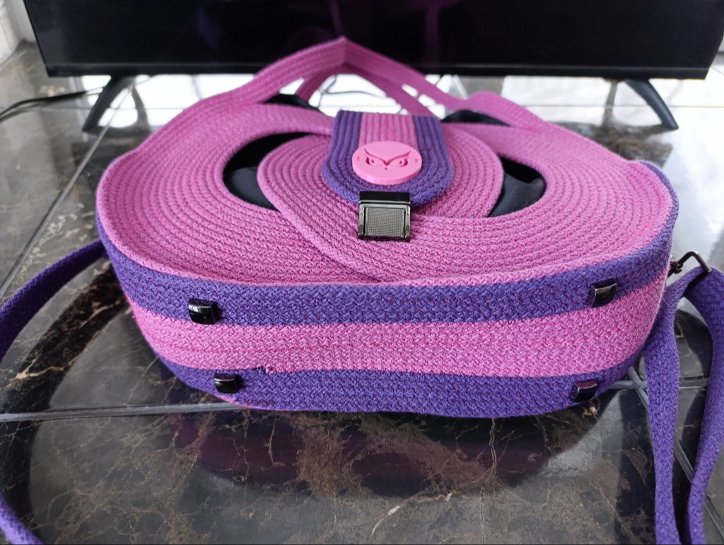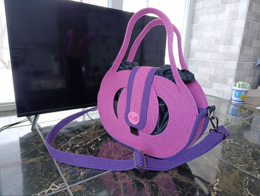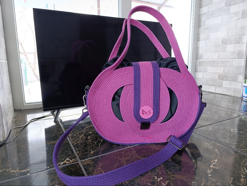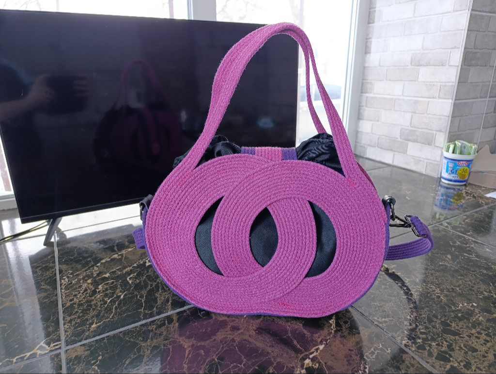 Продам сумку ручної роботи. Виготовленої зі спеціального шнура. Колір: поєднання рожевого з фіолетовим. Присутня фурнітура кольору "Нікель". Внутрішня сумочка зроблена у вигляді торбинки на затяжках. Матеріал внутрішньої сумочки габардин і саржа. Добре тримає форму. Є плечовий ремінець. Розмір сумки: 34×25 см. Також приймаю замовлення на виготовлення сумок.